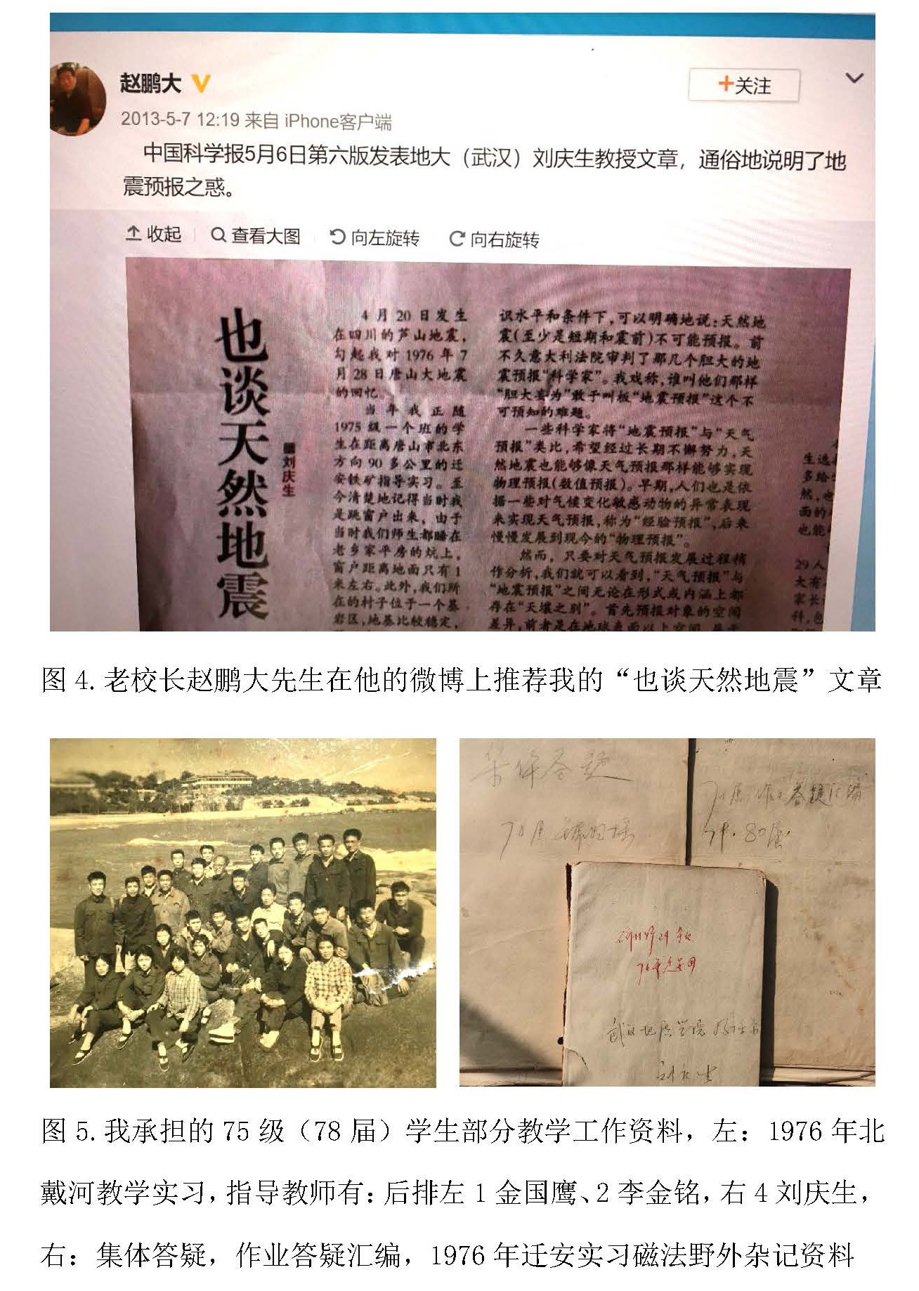 应主持人邀请,我们三位老师,罗延钟教授,史元盛教授和我发言,共同回忆了当年诸多亦师亦友的有趣故事。我的发言简短回顾了和一班同学经历的1976年7月28日的唐山大地震,那是一场与生死较量的经历。所幸,在这场罕见的大地震中,我们全体师生毫发未损。为此,我还撰写了一篇科学网博文“也谈天然地震”,阐述我对天然地震形成机制的粗浅认识,文章被中国科学报转载,并荣幸被我们学校老校长,中国科学院院士赵鹏大先生微博推荐:“中国科学报(2013年)5月6日第六版发表地大(武汉)刘庆生教授文章,通俗地说明了地震预报之惑。”(图4)我当年还是助教,主要承担这一届学生在北戴河的专业课程“磁法勘探”的教学实习和唐山迁安的生产实习。在这些过程中,我和同学们同吃同住同学习,师生双方亦师亦友,是一段难得的阳光快乐时光,至今我还保留一些当年参与教学的资料(图5)。