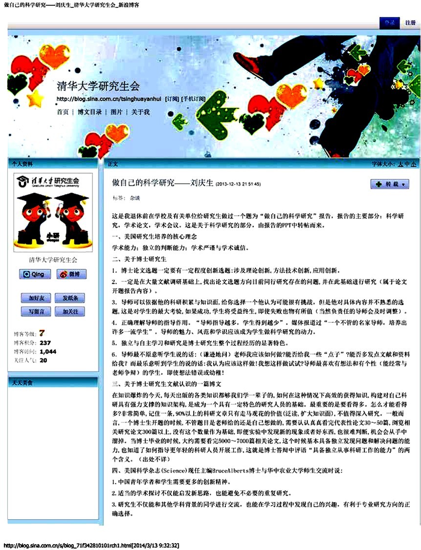 图4. 清华大学研究生主页转载我的“做自己的科学研究”报告的内容摘要
