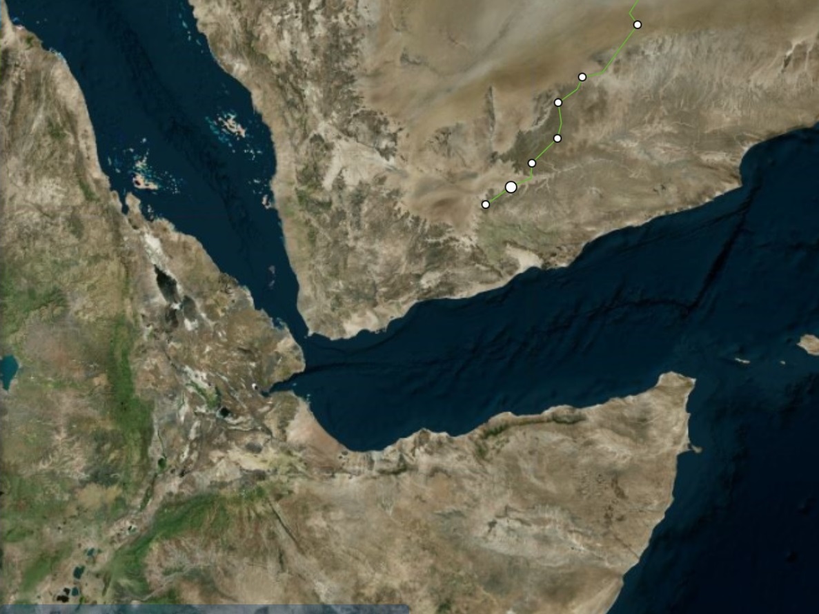 2025年10月8日,Rory 的白色点位和绿色轨迹。接近也门的亚丁湾, 北纬15°, 从天上看似鳄鱼嘴,是虎口咽喉要道,索马里海盗最猖獗的区域(马鸣 截屏)
