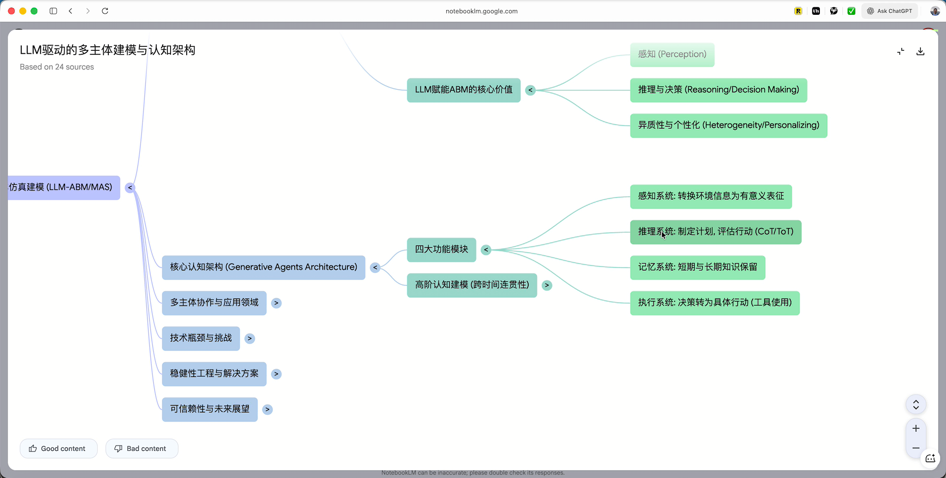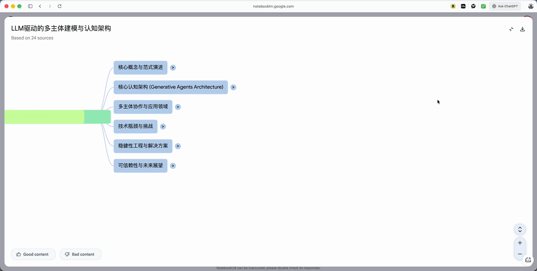 点击进入后,导图默认是收起的,你可以根据偏好逐层展开。例如,它展示了 LLM 智能体的飞跃与功能增强,包括感知、推理、记忆、执行四大模块。这对于快速理清知识结构非常有帮助。