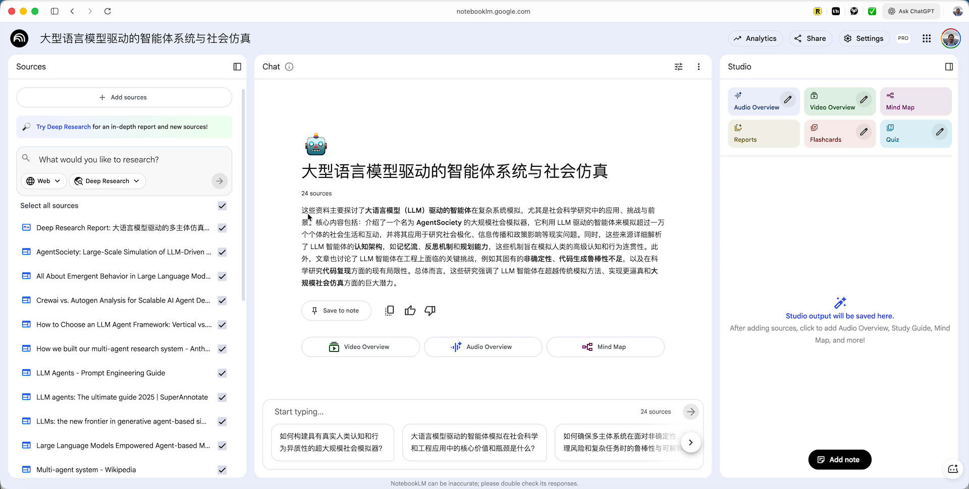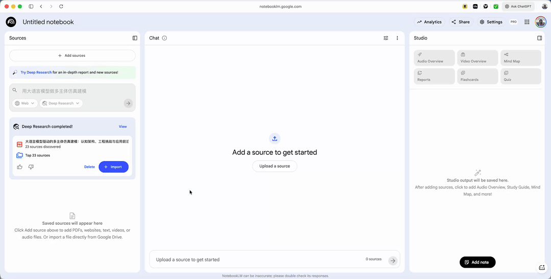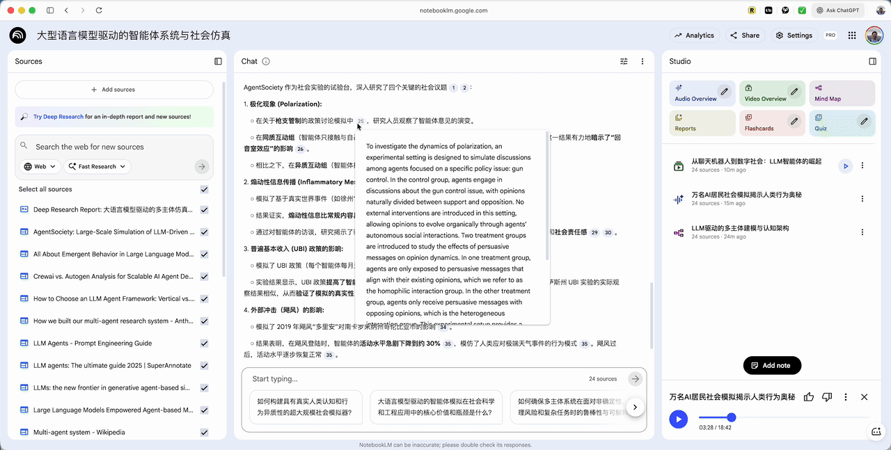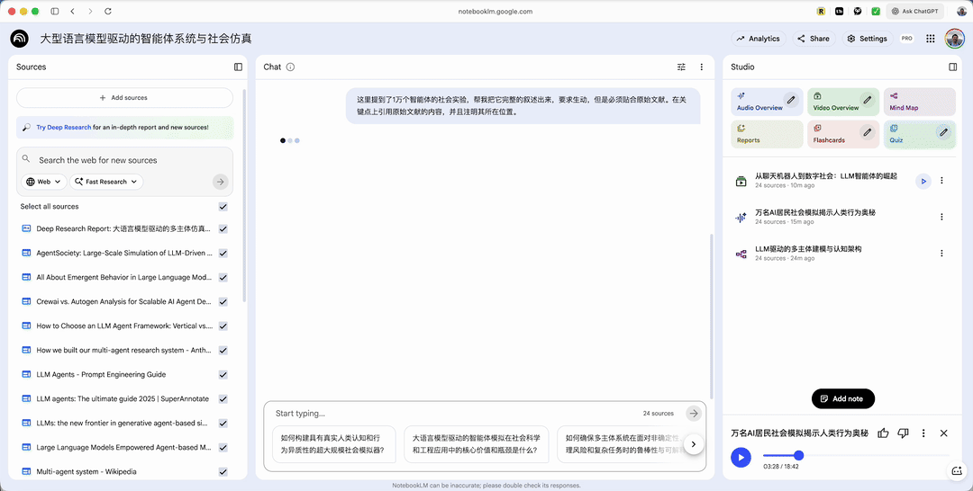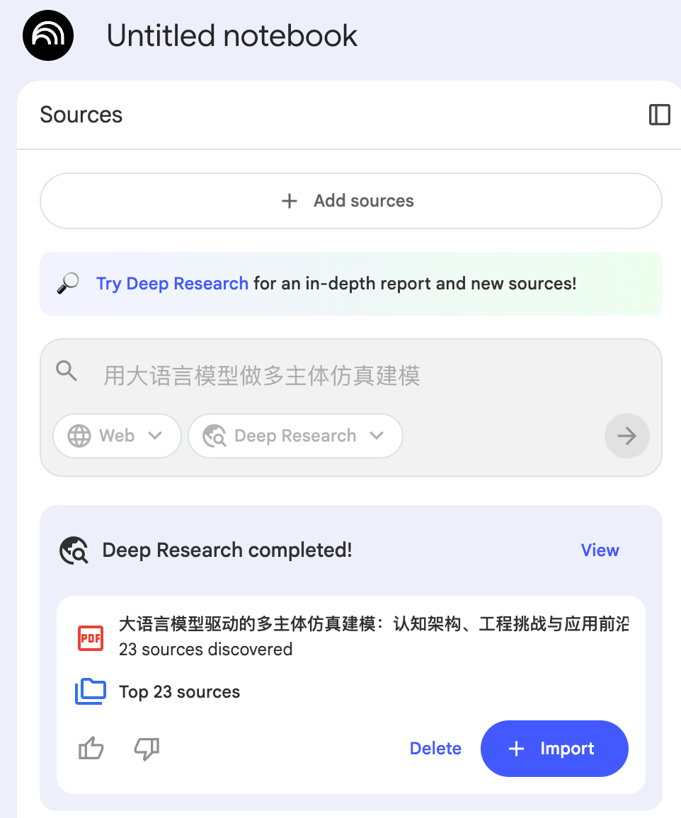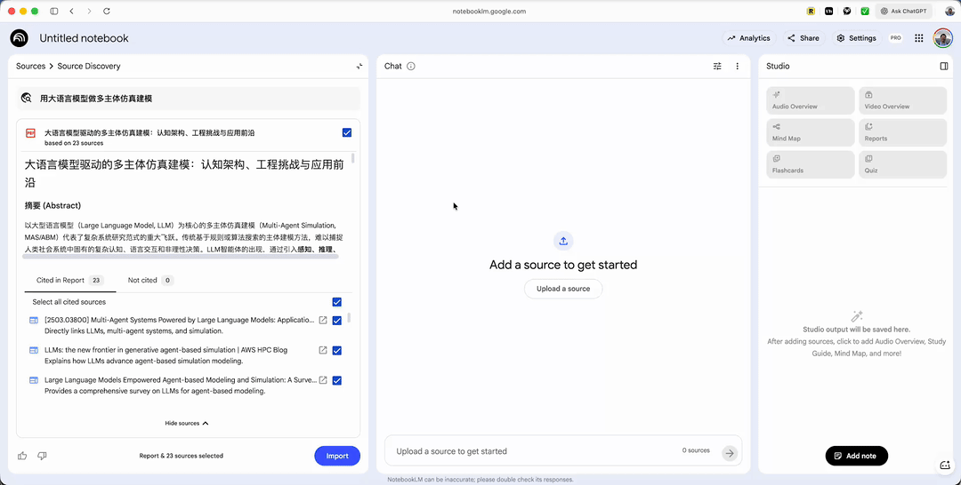 但你很难想象,把那份报告,连同它背后查阅的 20 多篇原始文献的全文,一一搬到 NotebookLM 里进行后续处理。在过去,这原本是割裂的、需要大量手动操作的过程。而现在,NotebookLM 自动替你完成了从调研、下载、整合到导入的全过程。