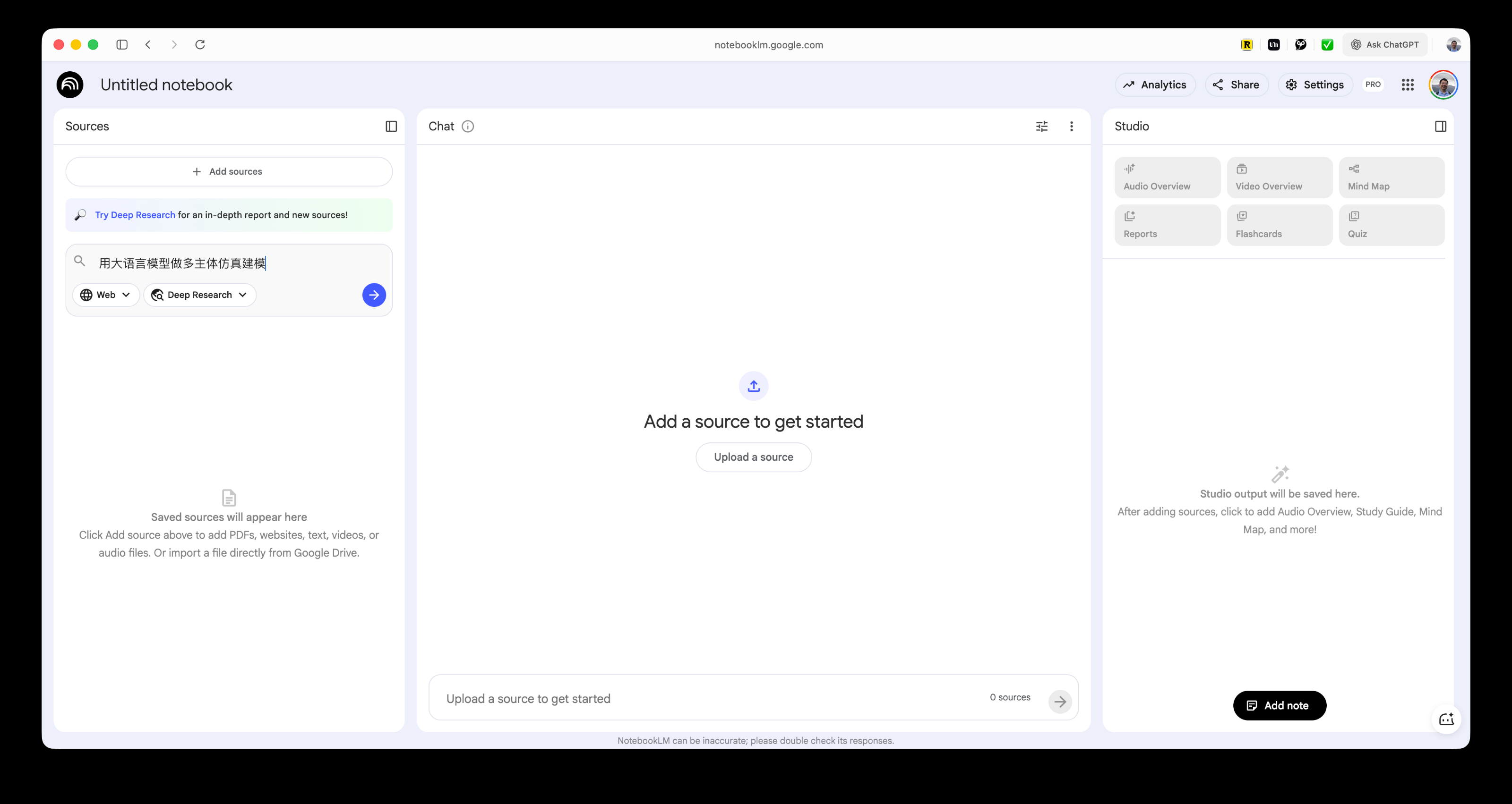 操作过程非常直观:将主题输入进去,务必注意选择 Deep Research 选项,然后点击运行。