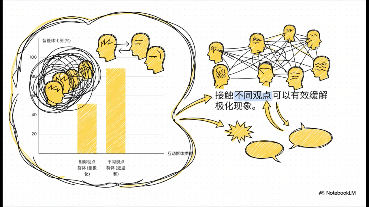 视频中提到的实验结果非常反直觉:在观点极化实验中,如果 AI 只与观点相近的同类交流,52% 的 AI 观点会极端化;但若处于混合观点环境,89% 的 AI 观点反而变得更温和中立。这生动演示了「回音室效应」的危害。