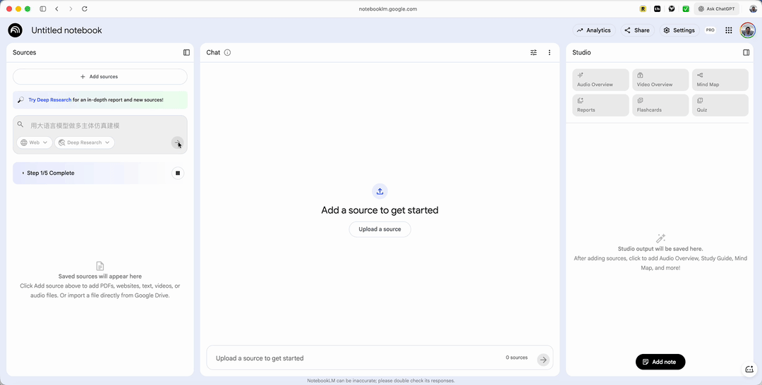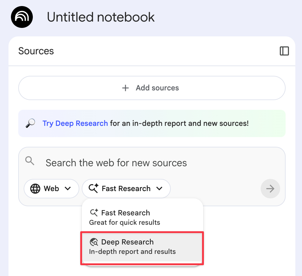 原先 NotebookLM 这里只有一个 Fast Research (快速调研) 功能,主要用于快速获取信息。现在有了 Deep Research,它号称能够生成一份非常完整的深度调研报告。