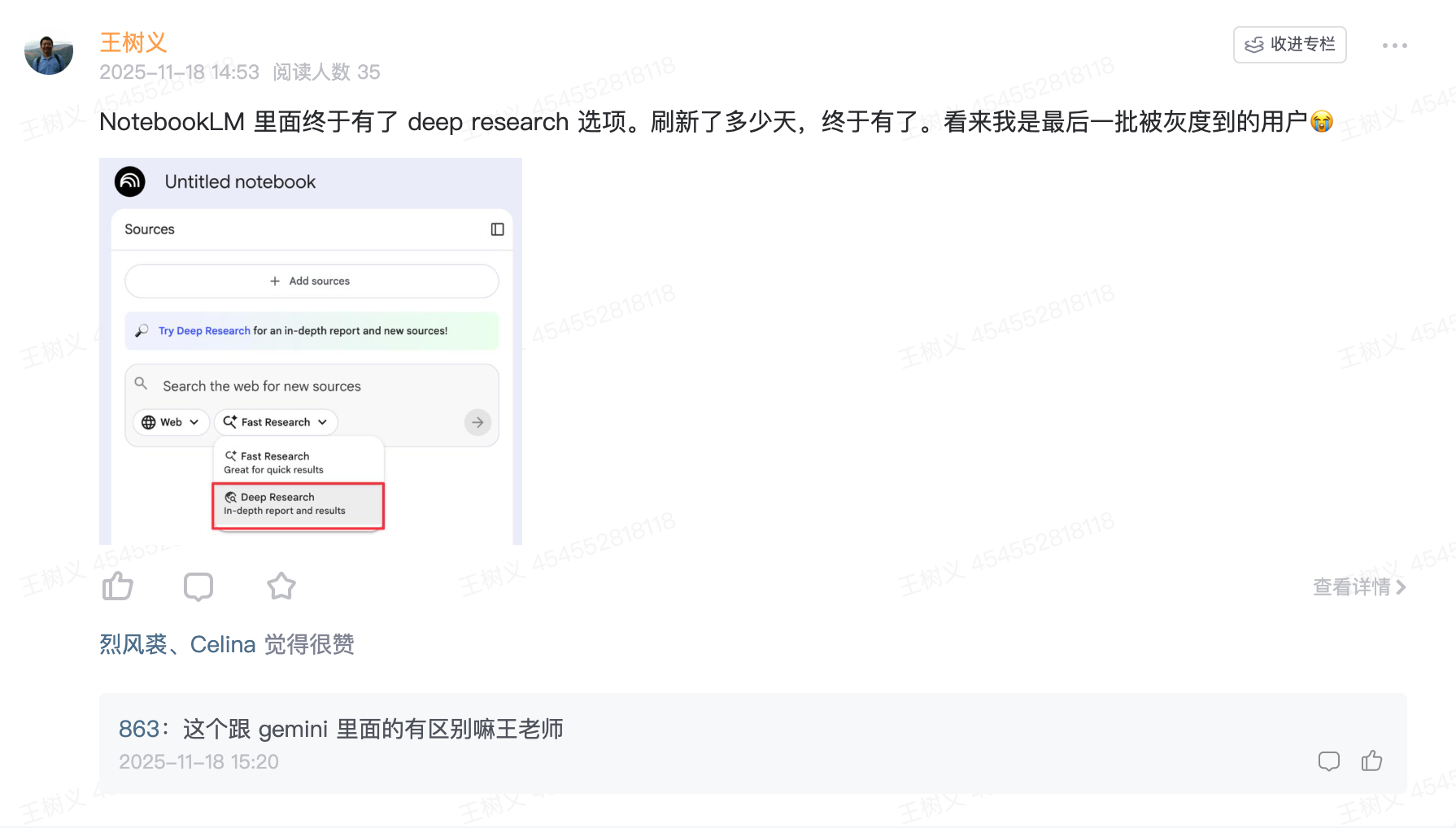对比我在知识星球里分享这个功能时,有星友问我:这个功能跟 Gemini 里的 Deep Research 有区别吗?