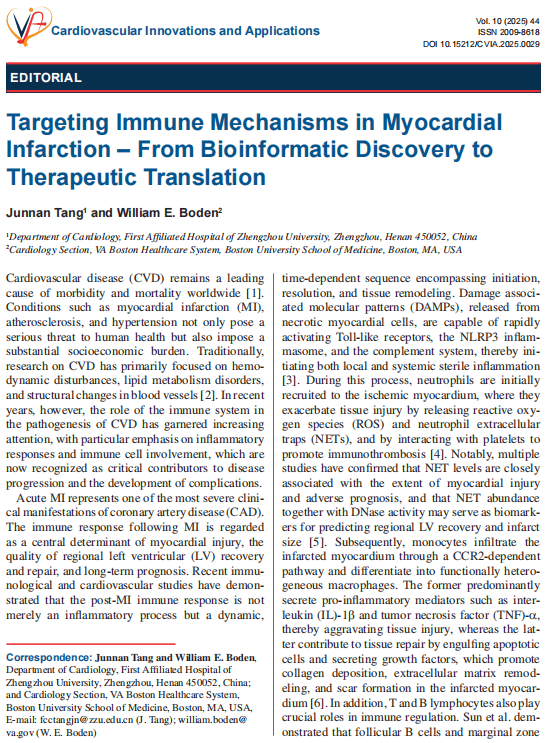Tang Jn , Boden WE. Targeting Immune Mechanisms in Myocardial Infarction – From Bioinformatic Discovery to Therapeutic Translation. Cardiovascular Innovations and Applications. 2025. Vol. 10(1). DOI: 10.15212/CVIA.2025.0029