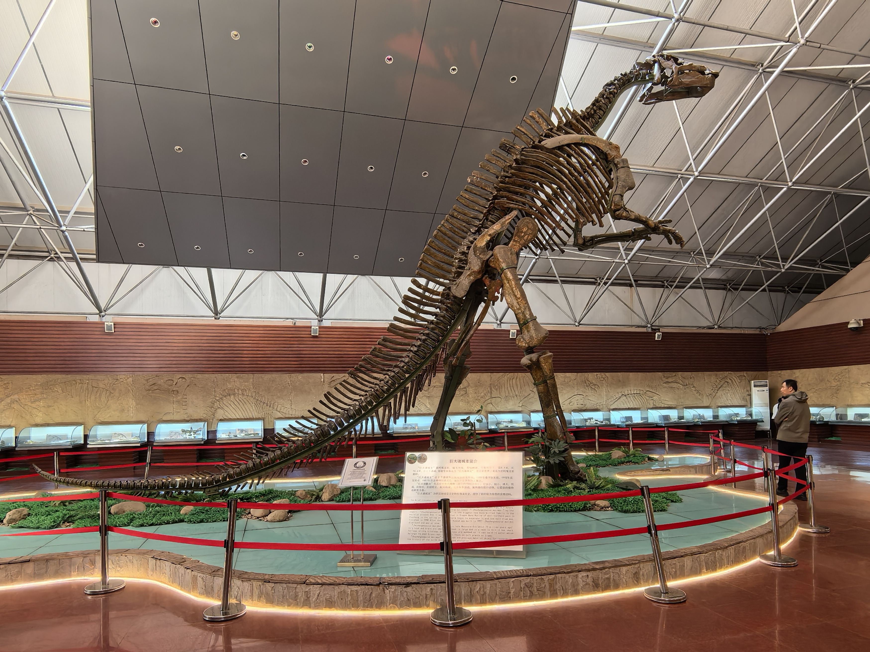 站在它脚下,人类的渺小感油然而生,抬头仰望,其身躯挺拔修长,宽扁的鸭状喙仿佛还在呼吸,粗壮的后肢如巨柱般支撑着庞大的躯体,长长的尾巴向后延伸,保持着身体的平衡,每一块骨骼都透着史前巨兽的磅礴气势,骨骼的结构清晰可见,诉说着亿万年的地质沉淀。讲解员结合科考资料详细介绍,这具化石出土于诸城恐龙涧,是1988年至1991年第二次大规模发掘的核心成果,经古脊椎所专家鉴定,为全新鸭嘴龙物种,因出土于诸城而得名“巨大诸城龙”,被誉为“世界龙王”。它的发现,不仅填补了我国大型鸭嘴龙化石研究的空白,更在全球鸭嘴龙科分类与演化研究中占据重要地位。