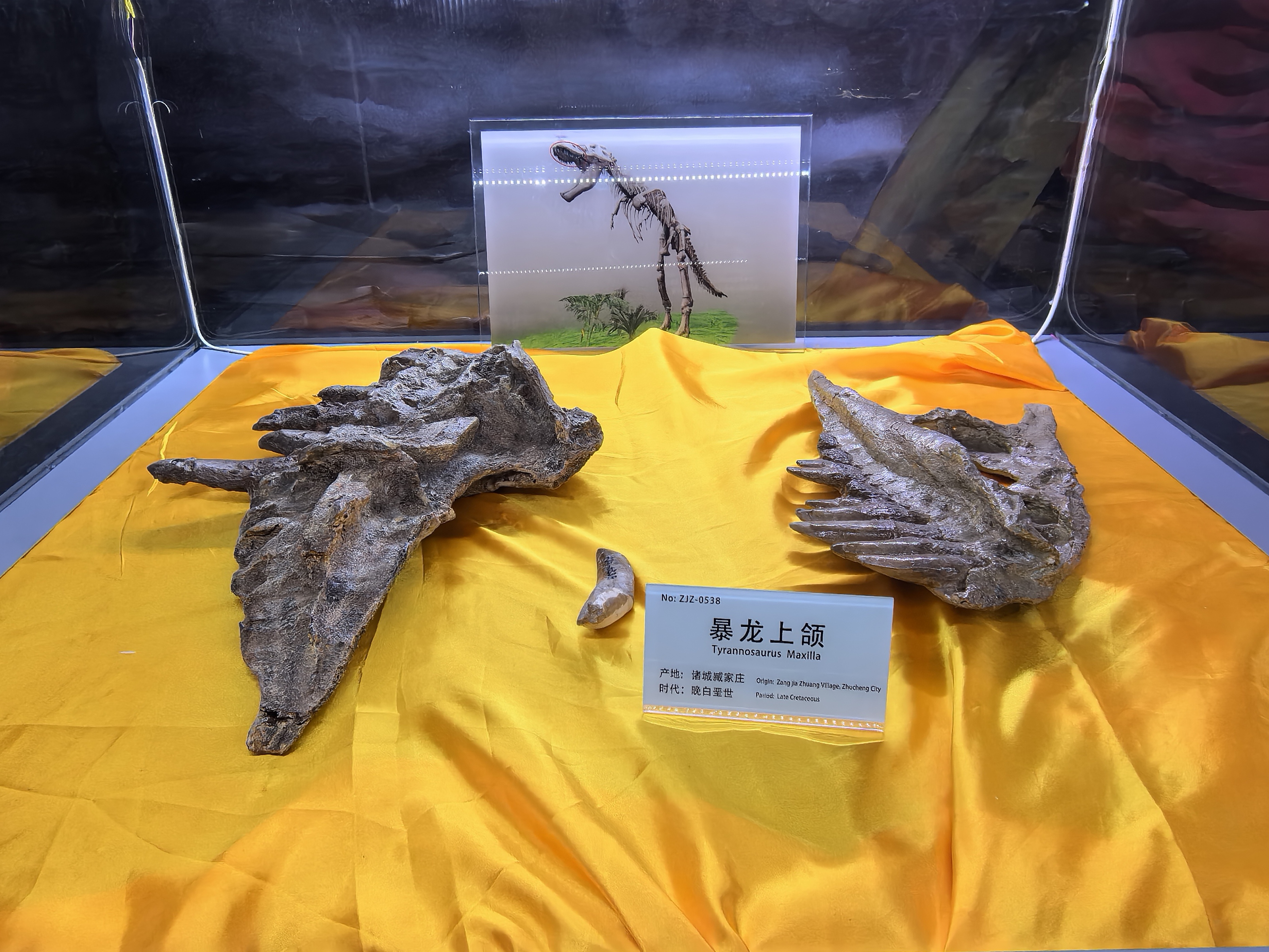 馆内的核心展品无疑是巨型诸城暴龙化石,这是白垩纪晚期亚洲大陆上当之无愧的“末代暴君”,体长约11米,站立高度约4米,体重约6吨,拥有锋利的牙齿与强劲的下颚,咬合力极强,是当时顶级的掠食者,主要以鸭嘴龙、角龙等植食性恐龙为食。2025年,这里还发现了长1.21米的暴龙股骨化石,刷新了亚洲暴龙类股骨长度纪录,进一步证实了诸城暴龙的庞大体型与强悍实力。此外,馆内还收藏了世界唯一大型带羽毛暴龙——华丽羽王龙化石骨架,这一发现颠覆了人们对暴龙体表无羽毛的传统认知,为研究恐龙向鸟类演化提供了重要线索。