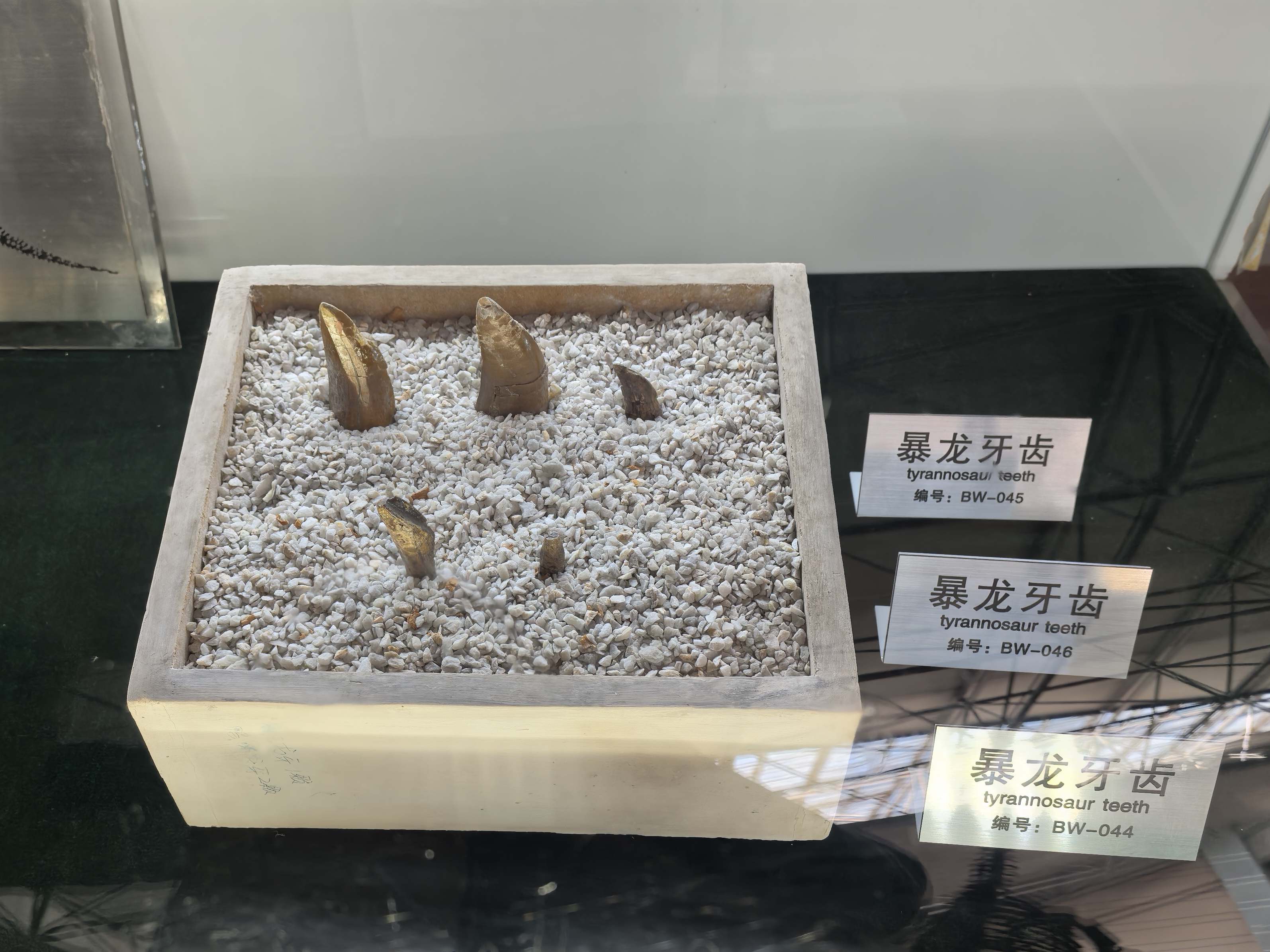 沿着长廊缓步前行,每一步都仿佛在穿越时空,每一块化石都藏着独特的科考信息。看到一块完整的鸭嘴龙肱骨化石,表面还残留着泥沙冲刷的痕迹,骨骼的关节面光滑完整,足以还原其肢体运动的幅度;一处头骨化石碎片上,牙齿的轮廓依然清晰可见,齿尖锋利,适合切割植物纤维,仿佛能想象到它当年撕咬食物的场景;还有几块小型的蜥脚类恐龙化石,与庞大的鸭嘴龙化石形成鲜明对比,展现出诸城恐龙群的多样性与生态复杂性;更有掠食性恐龙的牙齿化石,尖锐而粗壮,印证了白垩纪晚期诸城地区“群龙争霸”的生态格局。