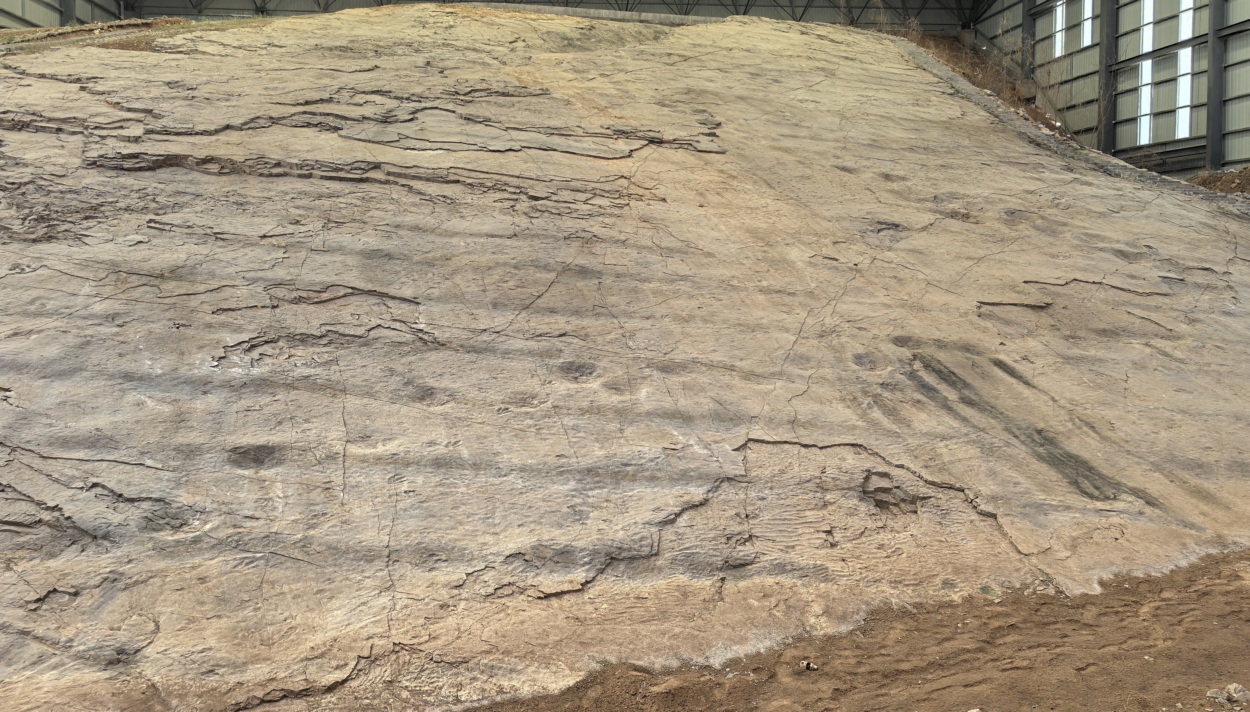 “这些化石不是零散分布的,而是见证了一场远古的‘集群灾难’。”讲解员的话语勾起了我们深入考察的好奇,结合现场地质剖面与专家研究成果,这场史前灾难的全貌逐渐清晰。经古脊椎所的同事研究证实,晚白垩世晚期,诸城地区气候发生突变,加之地质活动活跃,突发大规模泥石流或洪水灾害,大量恐龙在迁徙、觅食或饮水途中,被突如其来的泥沙迅速掩埋。由于掩埋速度极快,恐龙的遗体来不及被破坏,便完整保存下来,经过亿万年的压实、石化等地质作用,最终形成了如今规模宏大的化石长廊。而后期的地壳抬升与板块运动,让原本水平埋藏的化石层发生倾斜,形成了独特的45°斜坡景观,这种大规模、高集中度、保存完好的恐龙化石群,在全球范围内都极为罕见,是研究恐龙集群死亡原因、古气候突变、地质运动的天然实验室。
