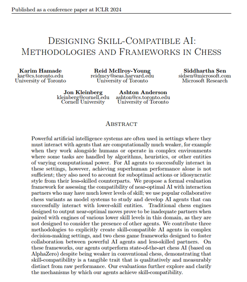 一篇发表在全球人工智能顶会ICLR 2024上的研究,用一个象棋实验告诉我们:AI的价值,不仅是它有多强,更在于它是否 “适配” 你。