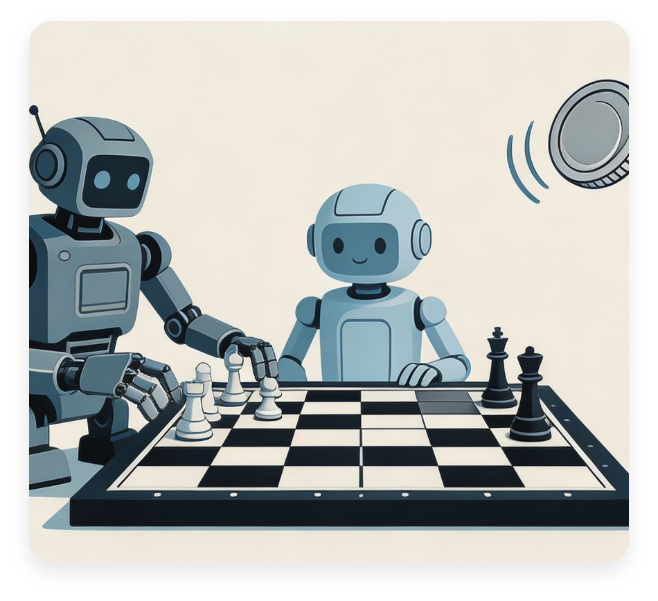 核心规则:随机接力。具体来说,每个队伍的下一步该哪个队员走,全靠抛硬币决定。这意味着,强大的AI也不知道下一秒是不是需要把 “指挥权”交给那个水平远不如自己的队友。