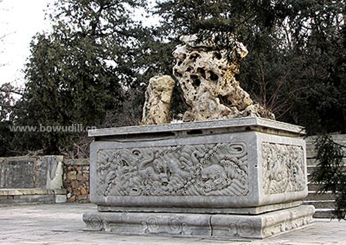 这是乾隆爷放在万寿山上的一个花盆儿。这花盆可真不错,正经八百是拿昂贵的石材——“艾叶儿青”(即有青灰色美丽花纹的大理石)雕凿的巨型盆景盆。盆里摆了两块优雅的山子石儿,当年傍边儿还可能种过什么奇异花木,虽然脆弱的花木没有逃过英法、八国那两场大火,可盆儿到底是石头做的,虽有一定破损,到底是“较为完整”地保存下来了,这才给今天的我们留下一件难得的精美工艺品。