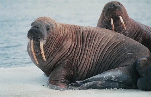 海象是一种只生活在北极海域的动物,因此可称得上是北极的特产动物。在太平洋,从白令海峡到楚科奇海、东西伯利亚海、拉普帕夫海;在大西洋,从格陵兰岛到巴芬岛,从冰岛和斯匹次卑尔根群岛至巴伦支海都有其分布。它体态庞大,皮厚多皱,尤其是脖子下面,堆积起厚厚的脂肪,为适应海中生活,耳壳退化了,只剩可以在水中关闭的耳孔。它的标志物——长牙是用来在海底刨取有壳的软体动物的有效工具,对北极动物研究颇深的前苏联科学家曾将其称为“用长牙挖掘海底的水下耕耘者”。